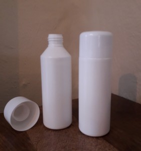 Wit plastiek flesje met mooie brede luxe schroefdop, geschikt voor 140 ml à 150 ml.